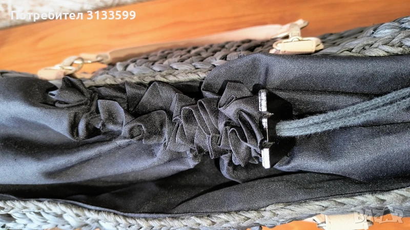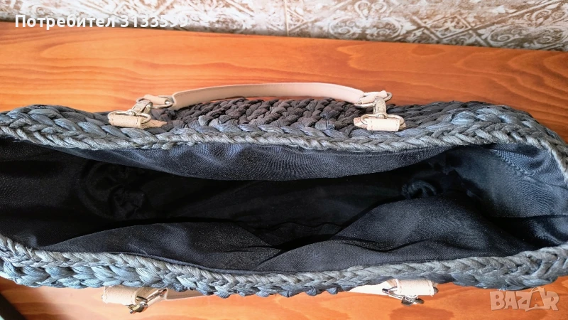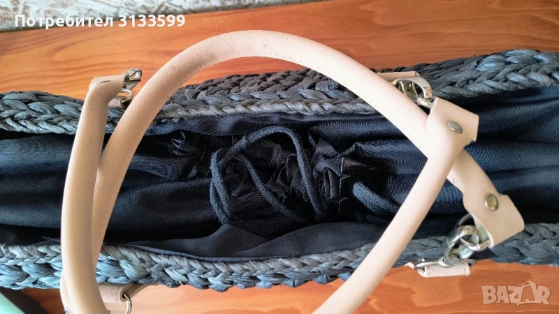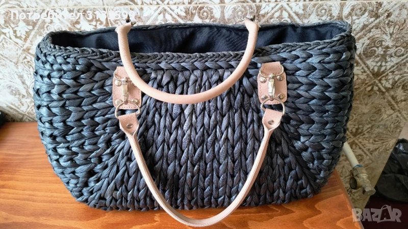 Тази модерна кошница, изплетена от царевична шума, е много здрава. Има дълги нитовани дръжки от изкуствена кожа и платнена подплата. Към подплатата има два малки джоба. Дори и по-големият джоб не може да побере телефон! Поради спецификата на материала, от който е направена чантата, тя не се затваря с цип, а подплатата отгоре е нанизана на шнур, при издърпването на който чантата се затваря.