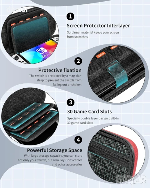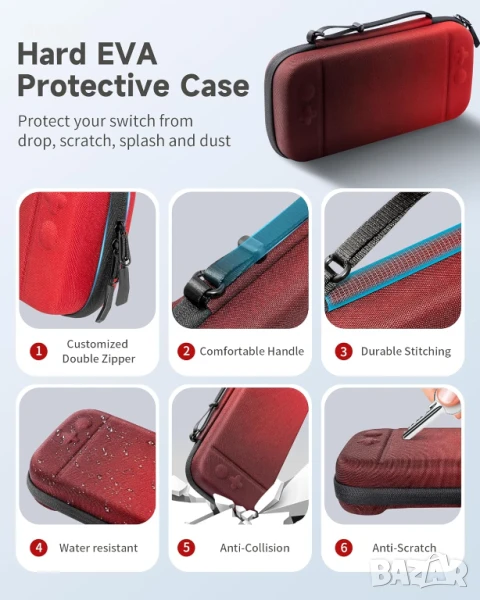 Включва протектор за екран от закалено стъкло и твърд защитен калъф, проектиран специално за Nintendo Switch 2 (само за модел 2025). Калъфът е изработен от плат с висока плътност, устойчив на надраскване, с дебела, абсорбираща ударите вътрешна облицовка за пълна защита от падания, натиск и вода. Просторният му интериор сигурно побира конзолата, ръкохватката Joycon, слушалките и игралните карти, с организирани отделения и каишки за бърз и безпроблемен достъп.