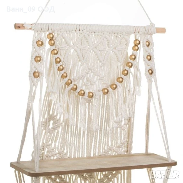 Декоративна висяща етажерка в бохо стил с дължина 82см, с 2 дървени рафта (40x13 см) и ръчно изплетен макраме гръб от памучно въже в бял цвят, с малки дървени мъниста и дълги ресни. Подходяща за малки саксии или декоративни предмети. Монтира се лесно на стена