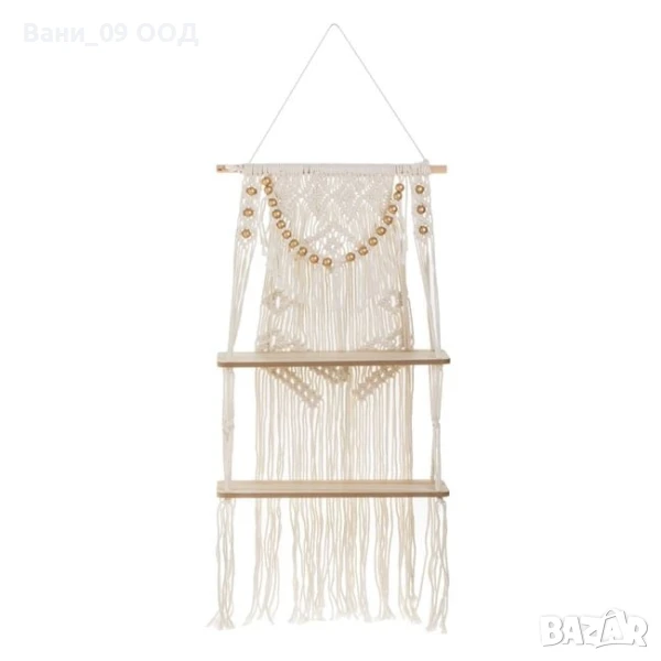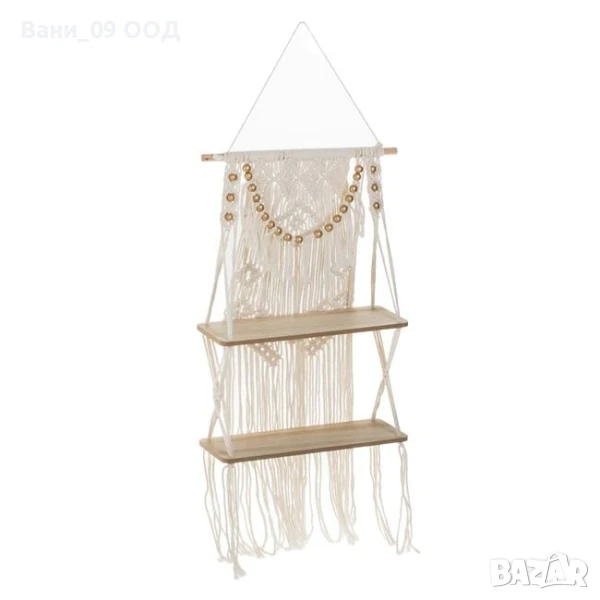 Декоративна висяща етажерка в бохо стил с дължина 82см, с 2 дървени рафта (40x13 см) и ръчно изплетен макраме гръб от памучно въже в бял цвят, с малки дървени мъниста и дълги ресни. Подходяща за малки саксии или декоративни предмети. Монтира се лесно на стена