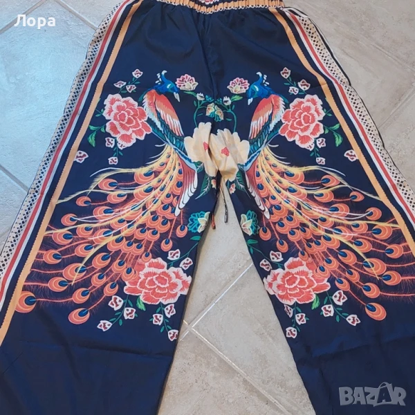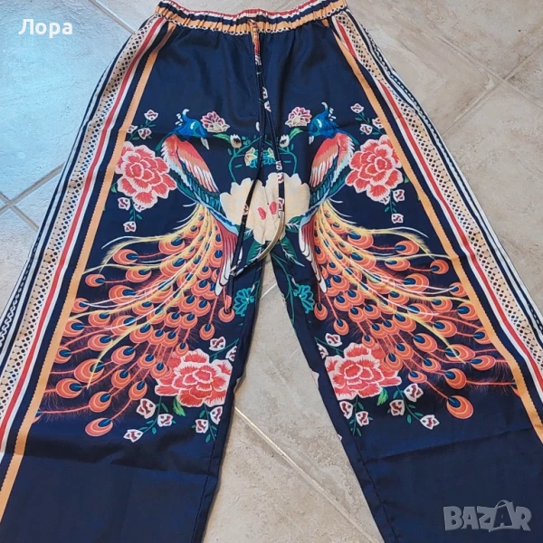 Дамски летен панталон в свеж десен.В талията е с ластик. Ширина в талията от 32 до 50 см едностранно. Дължина от талията до долу 101 см.Подходящ за С и М размер.