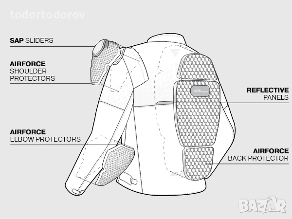 - дишащи, сертифицирани Airforce™ от SHIMA протектори за гръб, рамене и лакти