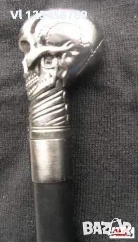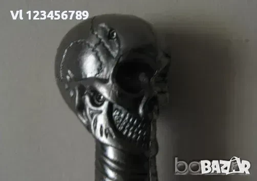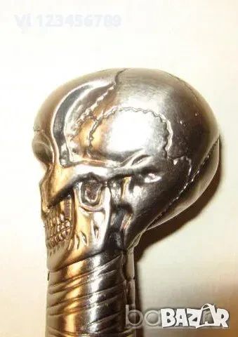 Ръкохватка - череп, двуделен, с размери около 44 х 55 х 55 мм изработен от сплав на цветни метали -в еликолепна имитация на патинирано сребро.