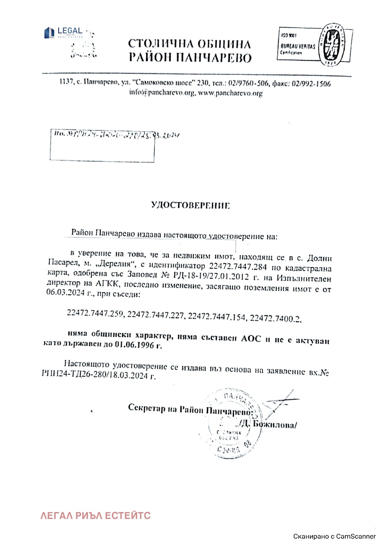 Агенция 'LEGAL REAL ESTATES' предлага за продажба уникален поземлен имот в землището на язовир 'Искър', местност АД ДЕРЕ с площ от 8 008 кв. м. и идентификатор 22472.7447.284. Имотът е равен, с високи борови дървета и попада в устройствена зона ССб по Общия устройствен план на Столична община. От имота се разкрива прекрасна панорамна гледка към язовира и планината, която никога няма да бъде закрита. До него се стига по асфалтов път и около 800 км. черен път, проходим за леки автомобили и каравани. В имотите никога не е извършвана сеч.