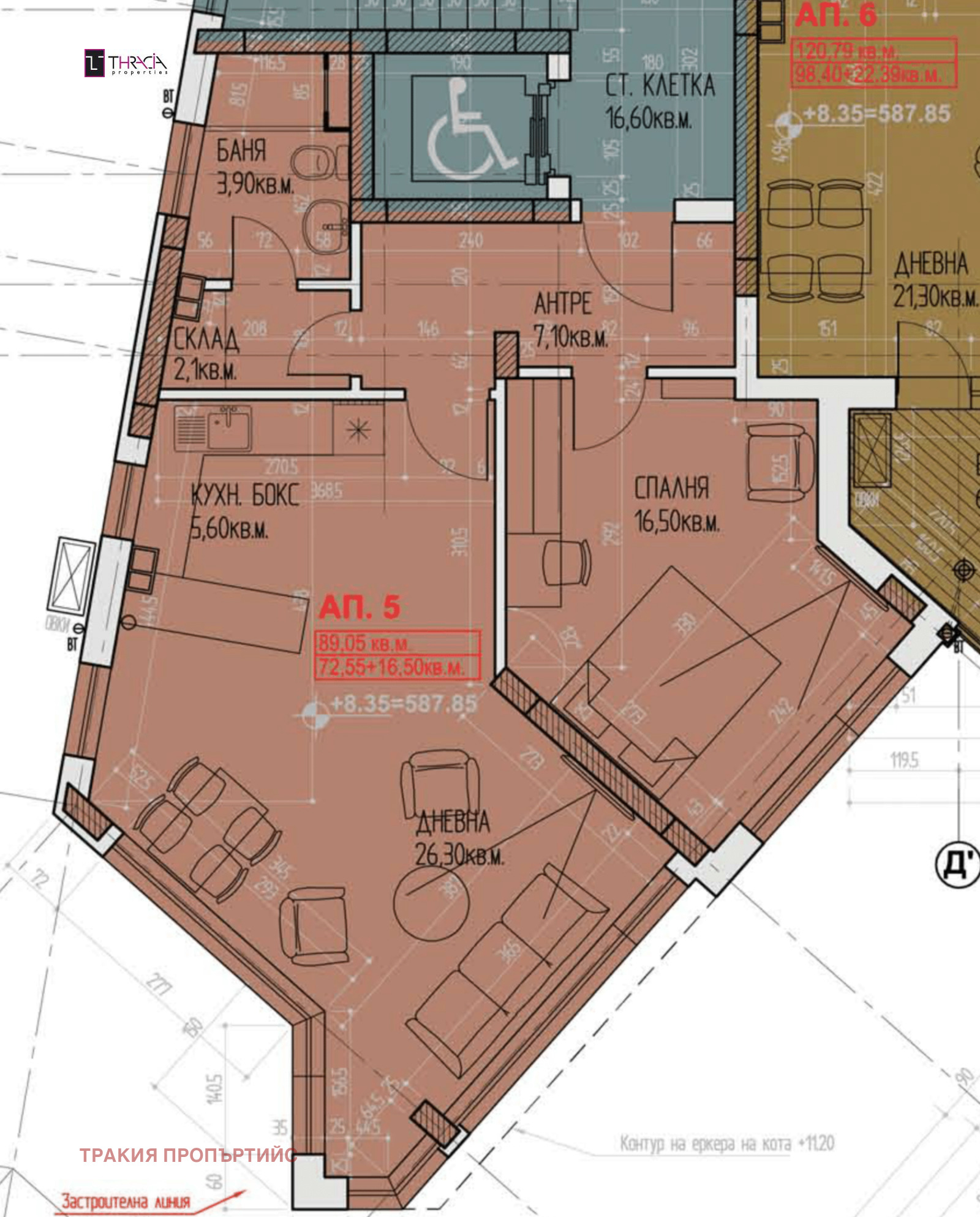 1.АПАРТАМЕНТ 5 : 2 стаен със ЗП от 72,55 м2, РЗП-89,05 м2, на четвърти етаж.