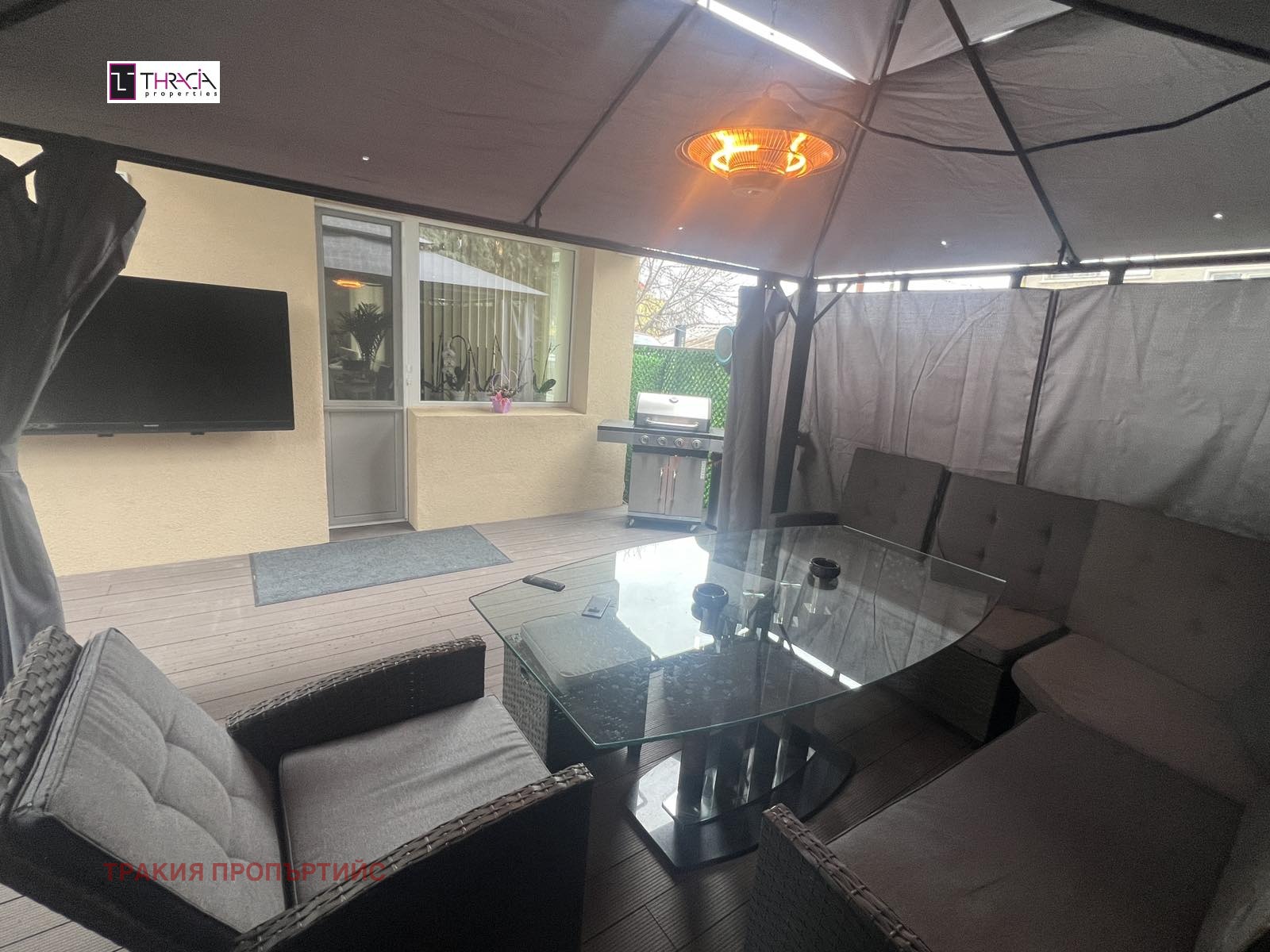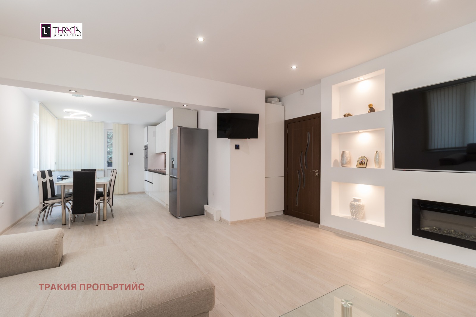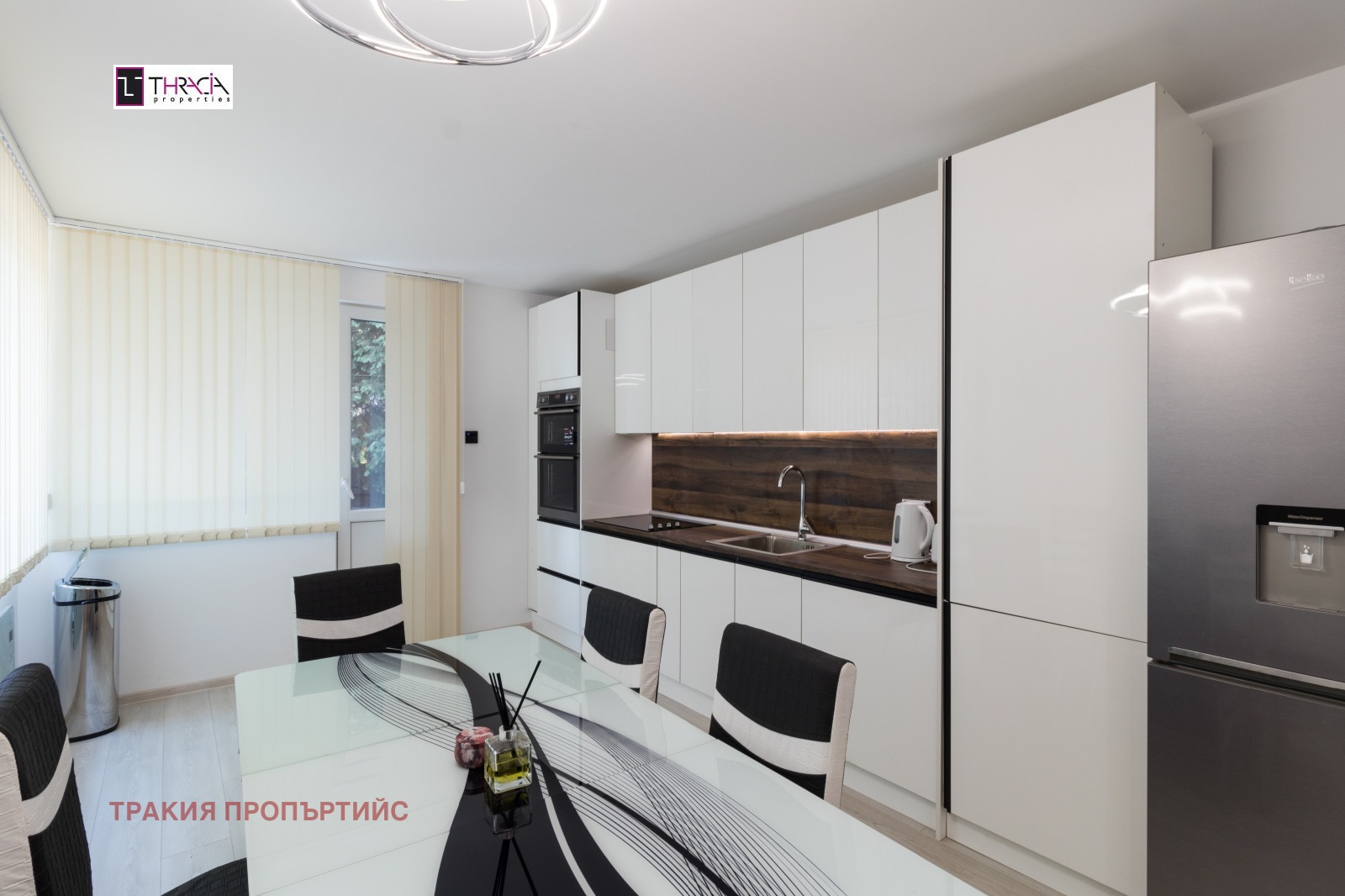 ОБЗАВЕЖДАНЕ: Кухня - двойна готварска печка, керамични котлони, хладилник с фризер и диспенсър, съдомиялна машина; Хол и трапезария - холона гарнитура, холна маса, телевизор, трапезна маса за 6 човека;