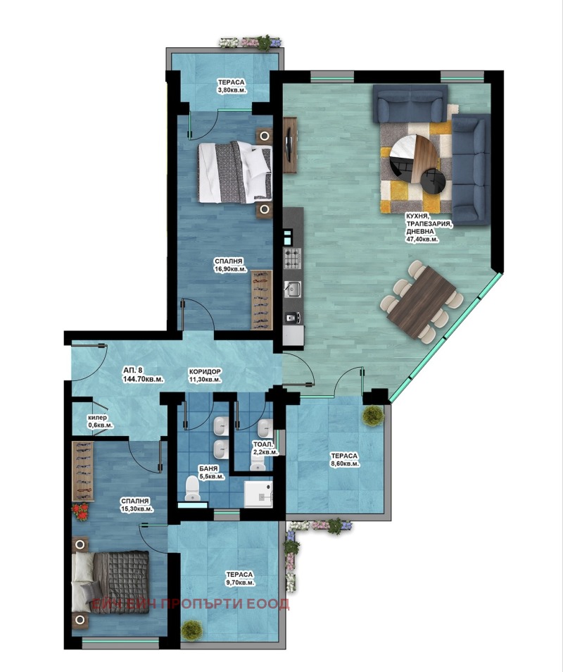 ✨ Изключителен тристаен апартамент с площ от 164.8 кв.м и 3 тераси! Този апартамент е за хора, които ценят простора, стилът и невероятните гледки. Разположен на 4-ти етаж от 8, той предлага перфектното съчетание между комфорт и енергийна ефективност, без да се откажете от прекрасната гледка и светлината.