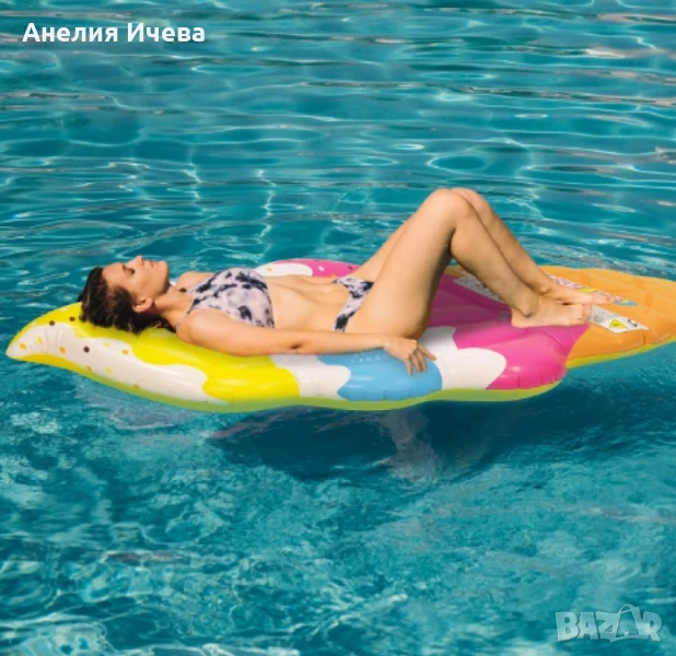 Тип продукт: Надуваем дюшек;Надуваем дюшек във формата на сладолед е идеален аксесоар за летния сезон. Подходящ е за използване в басейн, море или язовир. Комбинира удобство, атрактивна визия и забавление във водата, както за възрастни, така и за по-големи деца.Размери: 180 см дължина / 87 см ширина;Материал: Висококачествен винил (PVC);Предназначение: За възрастни и деца над 6 години;Брой потребители: 1.