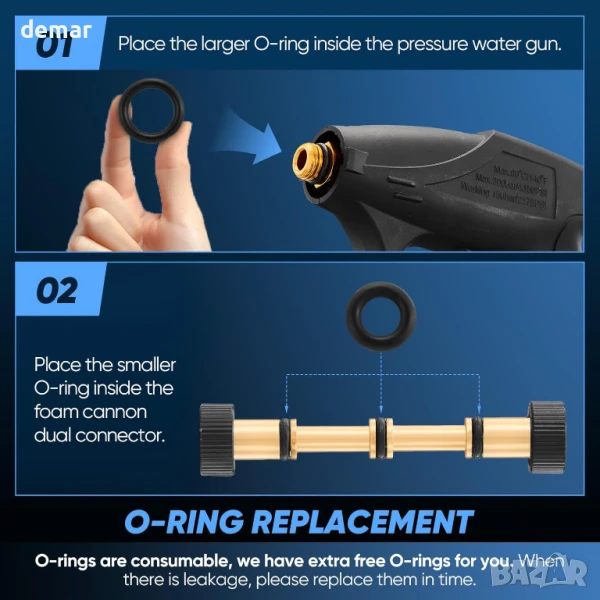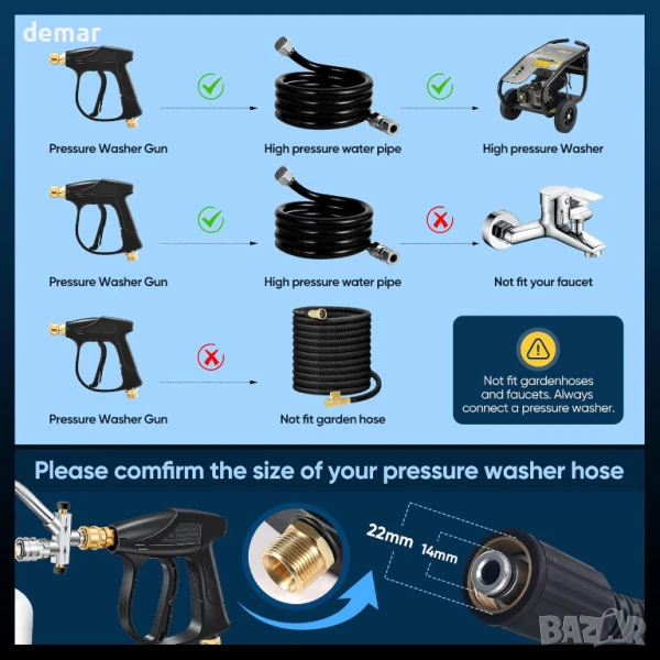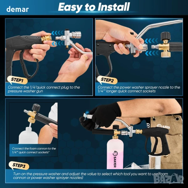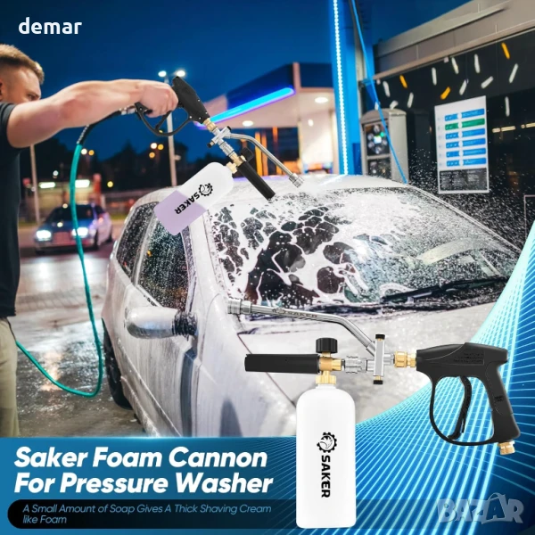 Този пистолет за пяна е проектиран изключително за употреба с водоструйки (не градински маркучи) и е съвместим с фитинги M22-14 мм с максимално налягане от 4000 PSI. Той разполага със система за двойно свързване, позволяваща бързо превключване между пяна и водна струя, плюс регулируем диск за контрол на концентрацията на пяна за различни задачи. Изработен от издръжлива мед, неръждаема стомана и пластмаса, той е подходящ за почистване на автомобили, прозорци, стени и външни повърхности. Комплектът включва пистолет за пръскане, бутилка за препарат, пистолет за водоструйка и пет дюзи (0°–65°) за различни модели на пръскане, всички съвместими с бързосъединителна тръба. Включени са и резервни О-пръстени за поддръжка.