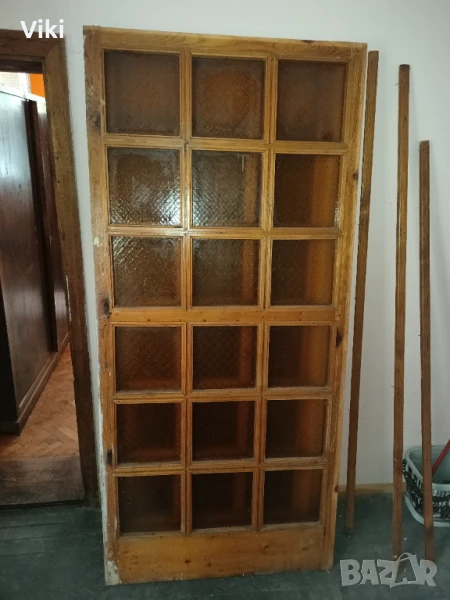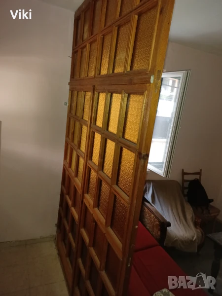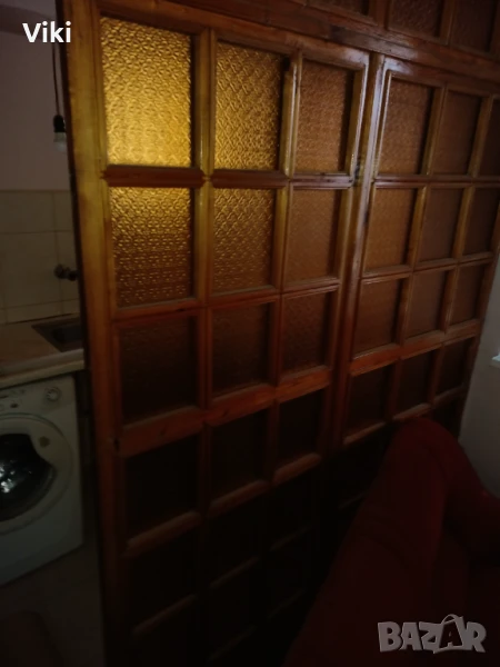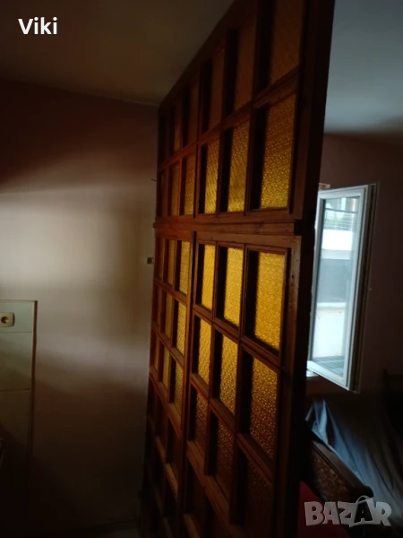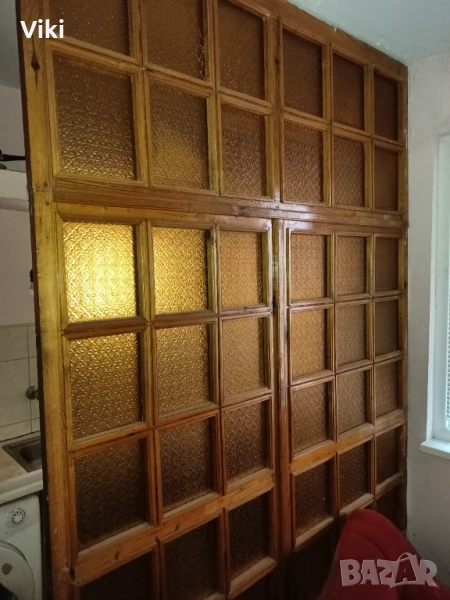 Продавам ретро параван дърво и стъкло+ врата. Служило е за преградна стена в кухня . Вече не пасва на интериора всичко е в добро състояние.