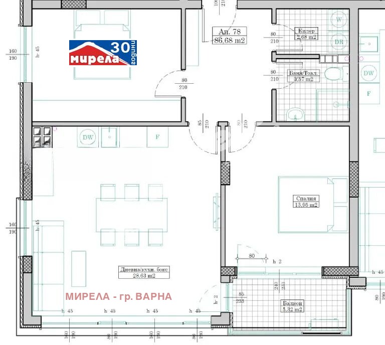 Имотът е с обща площ от 86.68 кв. м и отлично вътрешно разпределение: просторна дневна с кухненски кът, две спални (12.63 и 13.95 кв. м.), баня с тоалетна, отделно мокро помещение/килер, балкон с изложение юг, осигуряващ много светлина и приятна гледка.