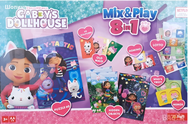 Настолна игра Mix & Play 8 in 1: Gabby's Dollhouse - Перфектният комплект от игри за забавление за всяко дете от популярния сериал Gabi's Dollhouse. Комплектът съдържа 8 различни вида игри, които гарантират разнообразен и увлекателен начин за прекарване на времето, сред които пъзел, домино, лото, мемори и други. Размер на опаковката: 40 x 27 x 6 cm - Цена: 29 лв.