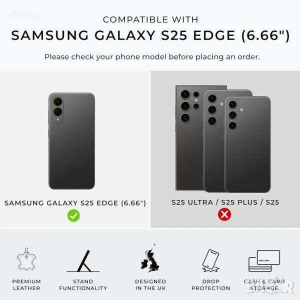 Ръчно изработен в Европа от естествена набукова кожа, този калъф-портфейл е проектиран ексклузивно за Samsung Galaxy S25 Edge 6.7". Той предлага пълна защита с гъвкава вътрешна обвивка, повдигнати ръбове и специална защита на камерата. Калъфът включва три слота за карти, отделение за пари, магнитно закопчаване, хоризонтална стойка за гледане и прецизни изрези за пълен достъп до бутони, портове и високоговорители.