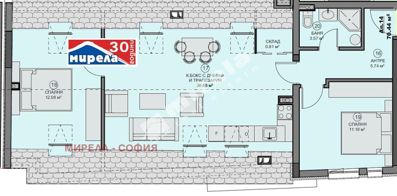 Разпределението на предлагания имот е антре, дневна с трапезария и кухненски бокс, две спални и баня с тоалетна.