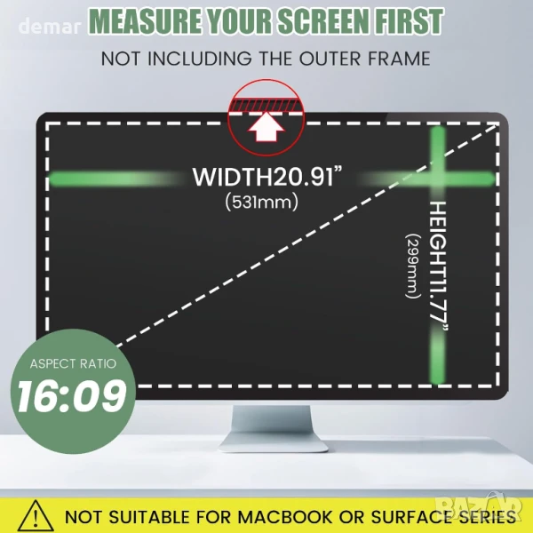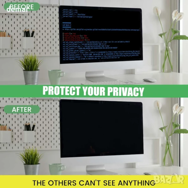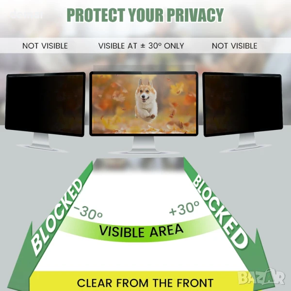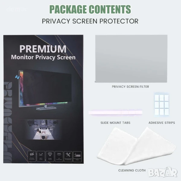 Този екран за поверителност на компютъра е с многослойно фолио, което ограничава ъгъла на видимост до 60–70 градуса, като по този начин предпазва екрана отпред и блокира страничните гледки, за да защити поверителността ви. Той също така намалява отблясъците, филтрира вредната синя светлина и UV лъчи и помага за предотвратяване на напрежението в очите по време на продължителна употреба. Екранът е защитен от надраскване и ежедневно износване, а монтажът е гъвкав с два метода на монтаж – или с лепящи ленти, или с плъзгащи се езичета (за монитори с повдигната рамка). Подходящ е за 24-инчови монитори със съотношение на страните 16:9 и е съвместим с марки като HP, Dell, Lenovo и други.