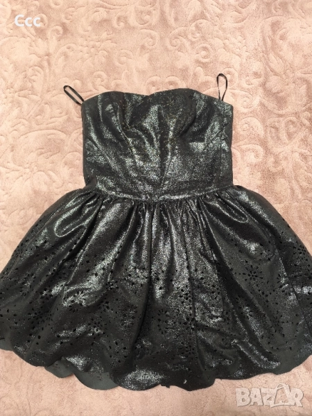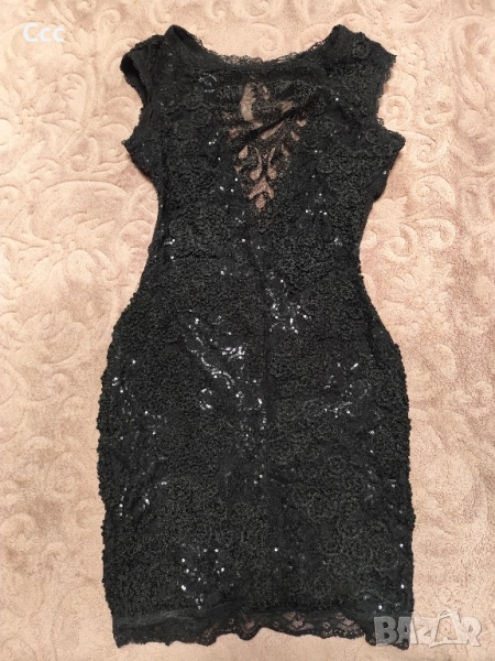 черна официална рокля с пайети, брошка и дантела, по етикет е Л размер, но се регулира с връзки и би станала и за С и М размер, цена 40 лв.