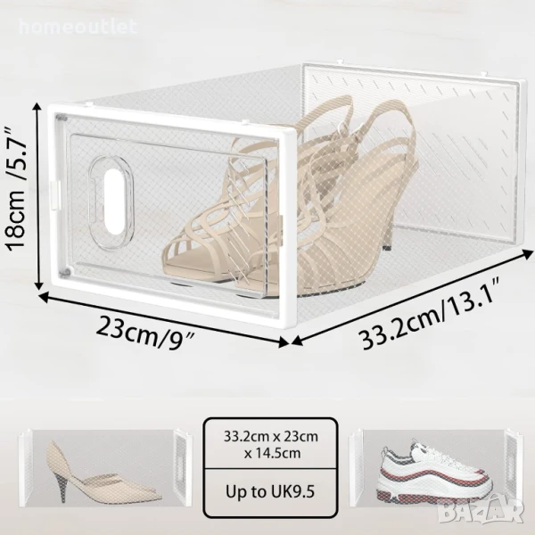Комплектът кутии за обувки, всяка от които с размери 33,2 x 23 x 18 см съдържа 12 части, което улеснява организирането на всички видове обувки.