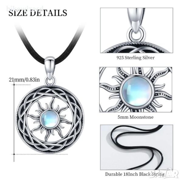 келтският възел е традиционен ирландски дизайн, който представлява вечна любов, вечно продължение и трансцендентност и предполага безкраен живот и безкрайна любов. Богът на слънцето сред тях означава смелост, яркост и топлина. Надявам се, че това колие ще ви придружава като слънцето и ще дава топлина на човека, който го носи. Отлично качество - Това колие е изработено от сребро 925 проба и е в ретро стил. Ослепителен лунен камък в средата е привличащ вниманието. Лунният камък отразява различни красиви лъчи под различни ъгли. Не е лесно да се окислява и да променя цвета си при полиране. Изящната изработка и гладките ръбове няма да надраскат кожата ви. Също така не съдържа олово, кадмий, алергични елементи и вредни съставки. Детайли за продукта: 21 x 21 мм / 0.83 x 0.83 инча. Тегло на висулката: 4.8 грама. Размер на висулката: дължина на верижката: 18 инча дължина + 2 инча регулируема дължина. Допълнителната верижка с удължение от 2 инча може да се регулира до подходяща дължина.