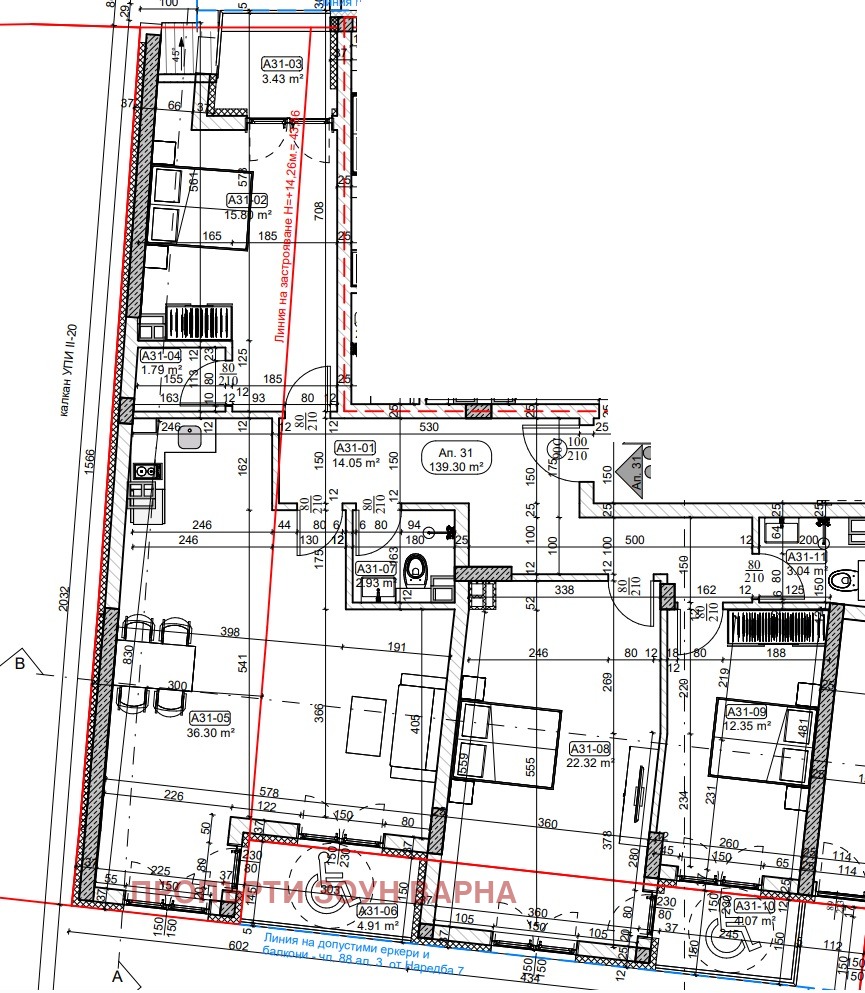 Имотът е ситуиран на шести етаж в сграда с асансьор и има следното разпределение: коридор, дневна с кухненски бокс - 36.30 кв.м., спалня 1 - 22,32 кв.м., спалня 2 - 15.80 кв.м. с дрешник 1.79 кв.м., спалня 3 - 12.35 кв.м., два санитарни възела и три тераси.