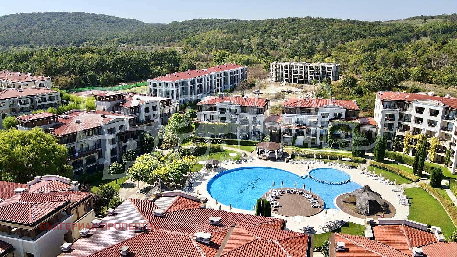 Мини курортът е ограден от зеленина и множество водни площи. Комплексът разполага с четири басейна с обща площ от 600 кв. м., разделени на две основни групи, преливащи един в друг. Атракцията и уникалността на басейните са множеството водопади, тангенторните струи, водният бар и мини детските пързалки.