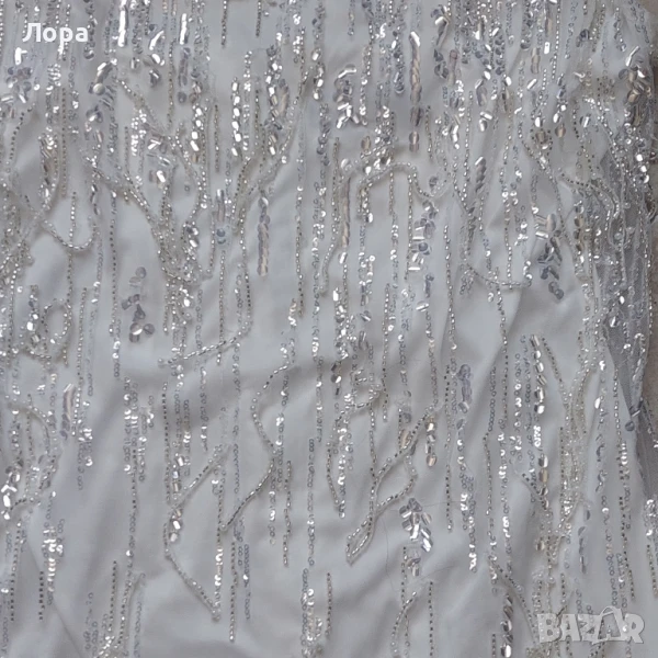 Дамска официална рокля. Бяла на цвят с цип на гърба. Гарнирана с тюл мъниста и паети Нова с етикет. Размери ширина от мишница до мишница 48 см. Талия 40 см. Ханш 45 см. Дължина 85 см. Презрамките се регулират. Роклята няма еластичност.