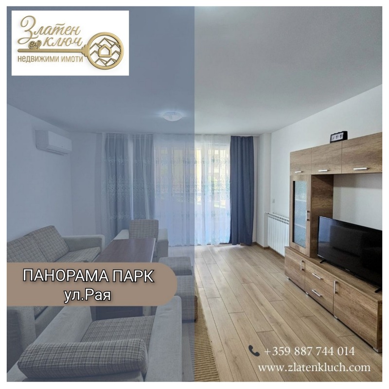 'ЗЛАТЕН КЛЮЧ- НЕДВИЖИМИ ИМОТИ' предлага за продажба НОВ, ДВУСТАЕН АПАРТАМЕНТ в жилищен комплекс 'ПАНОРАМА ПАРК ЗАПАД 2' /ул.Рая/ в кв.Христо Смирненски. С източно изложение, напълно обзаведен. Състои се от дневна с трапезария и кухненски бокс, самостоятелна спалня, баня с тоалетна, перално помещение, тераса и входно антре. Комплексът е луксозно завършен с контролиран достъп, отлично поддържани общи части, разполагащ с озеленен вътрешен двор, в който са ситуирани зона за отдих, фитнес, детска площадка.