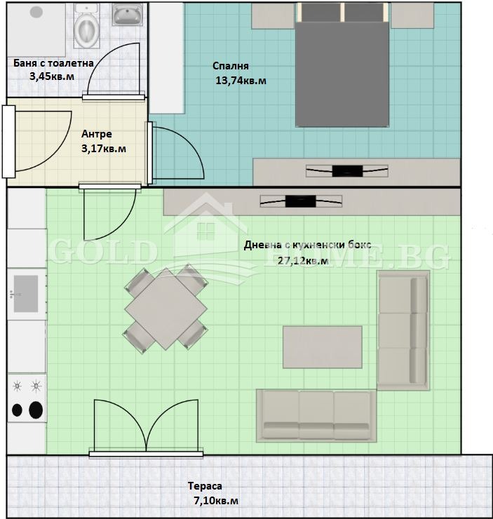 ✅ Жилището е по-просторно от обичайните двустайни ново строителство, състои се от: входно антре, голяма дневна с кухненски бокс, спалня с дрешник, тераса и баня с тоалетна. Прилагаме разпределение за Ваше улеснение.