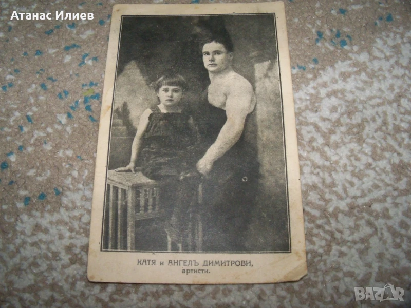 Стара пощенска картичка с Катя и Ангел Димитрови - циркови артисти. Ангел Димитро̀в е български цирков артист, режисьор и педагог. Роден е на 24 февруари 1890 г. в София. Ученик е на Петър Панайотов. От 1903 г. е част от неговия