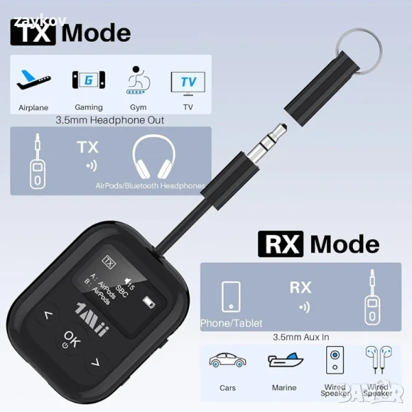 2-в-1 Bluetooth предавател-приемник: В режим на предавател, Bluetooth предавателят 1Mii ви позволява да предавате аудио от вашето устройство без Bluetooth, като например телевизор, компютър, развлекателна система в самолет/фитнес зала, към вашите Bluetooth слушалки/високоговорители. В режим на приемник, Bluetooth аудио адаптерът 1Mii ви позволява да свържете Bluetooth на вашия телефон/таблет към вашия кабелен високоговорител, слушалки, стереоуредба за кола или домашна стереоуредба.