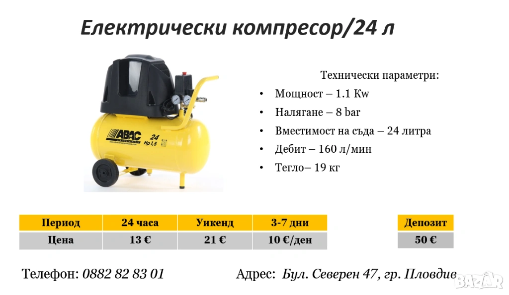 Компресор 24л под наем, снимка 1 - Компресори - 50777868 1/1