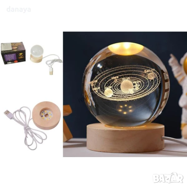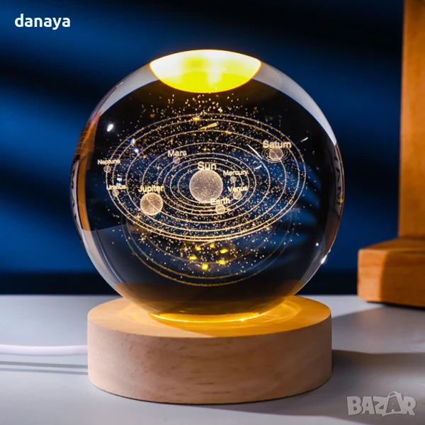кристална топка Слънчева система. Светещ кристален глобус върху дървена основа. Новата екзотична 3D кристална лампа със Слънчевата система и комети около нея ще внесе магия във вашия дом. Тя ще създаде приказно настроение в стаята още с първото включване. Изображението на Слънцето и останалите планети от нашата система в кристалната топка ще превърне всяка нощ в пътешествие в космоса.