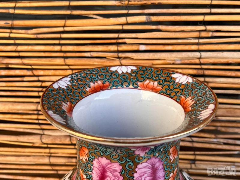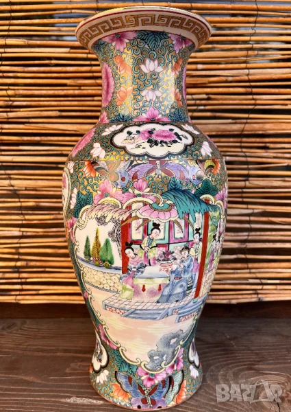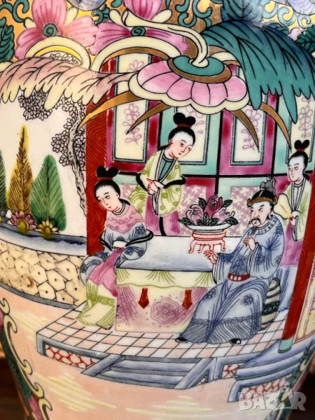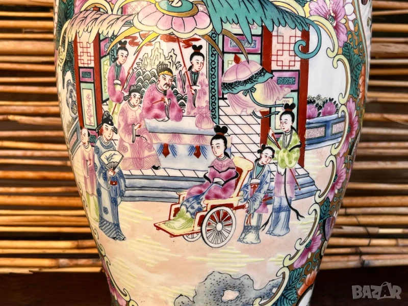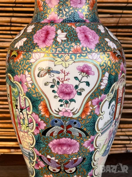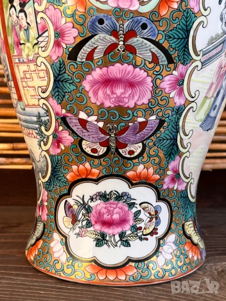 Ефектна и детайлно ръчно рисувана порцеланова ваза, вдъхновена от класическия китайски стил Famille Rose.