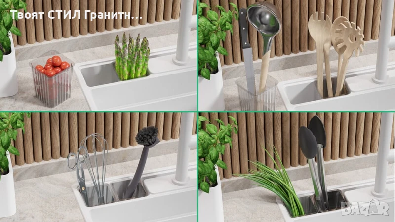 - Лява страна: Оборудвана с два включени органайзера – идеални за сушене на прибори за хранене, съхранение на кухненски принадлежности или пресни билки и съставки.