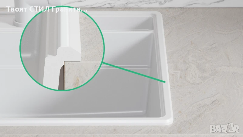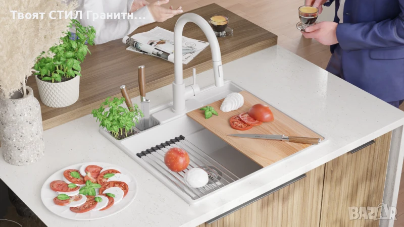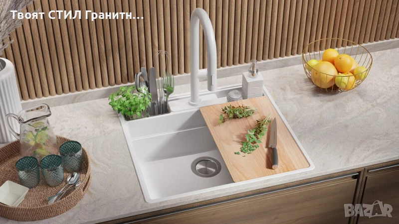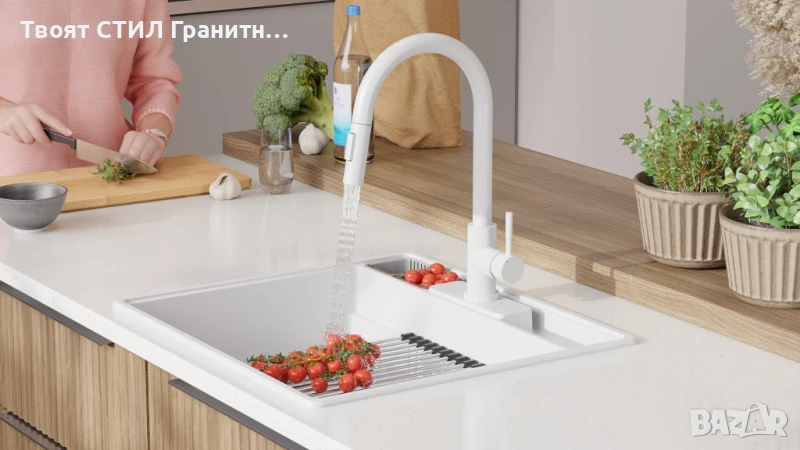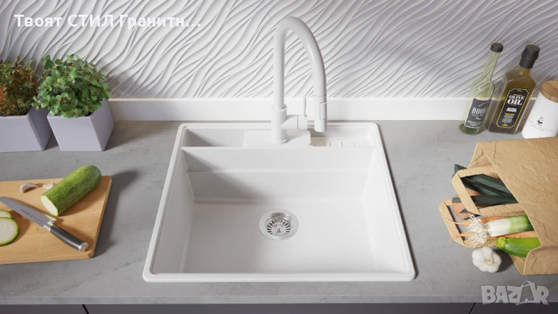 - Модерна кухненска мивка от гранит – издръжлива, елегантна и изработена за дълготрайност.