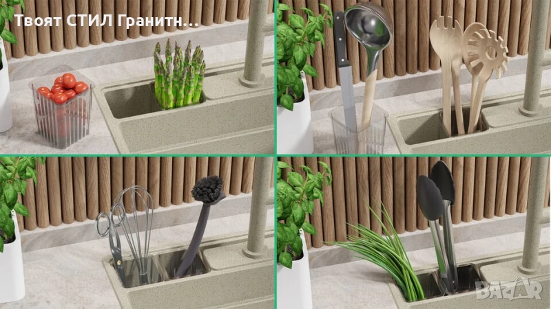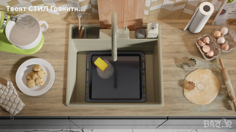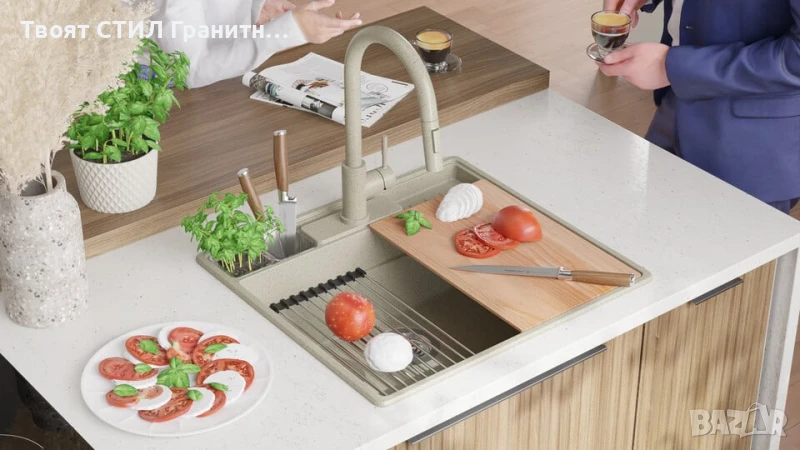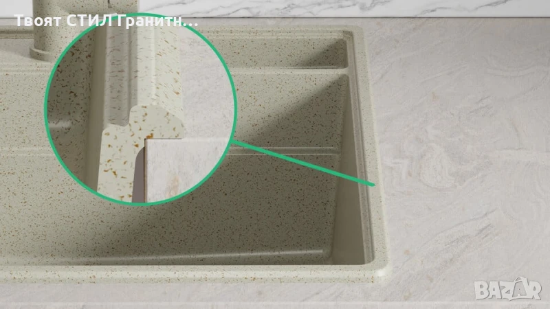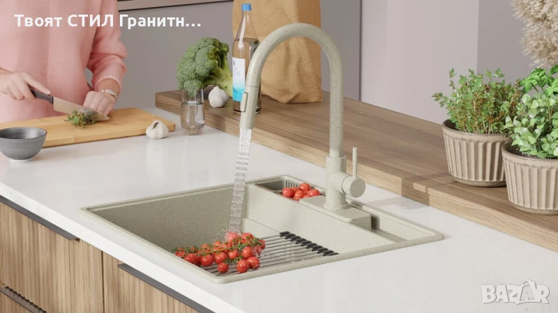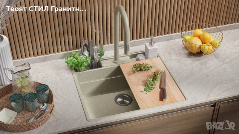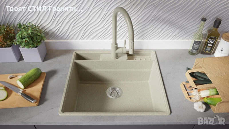 - Модерна кухненска мивка от гранит – издръжлива, елегантна и изработена за дълготрайност.