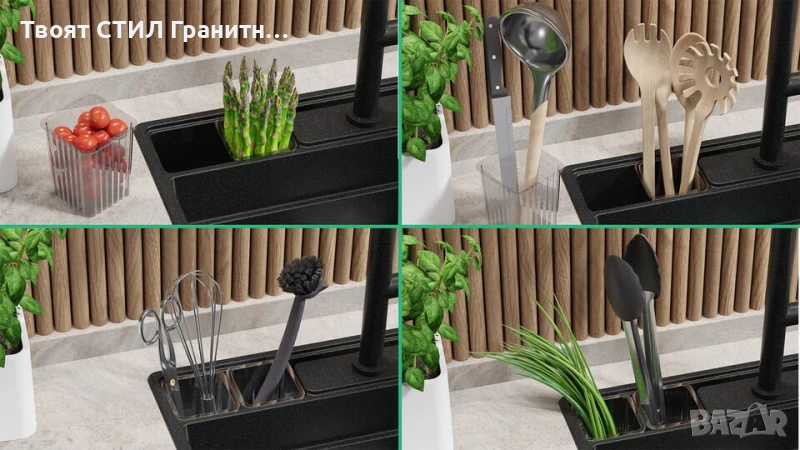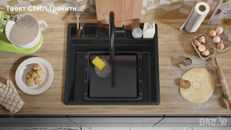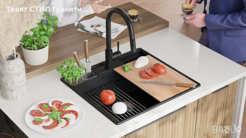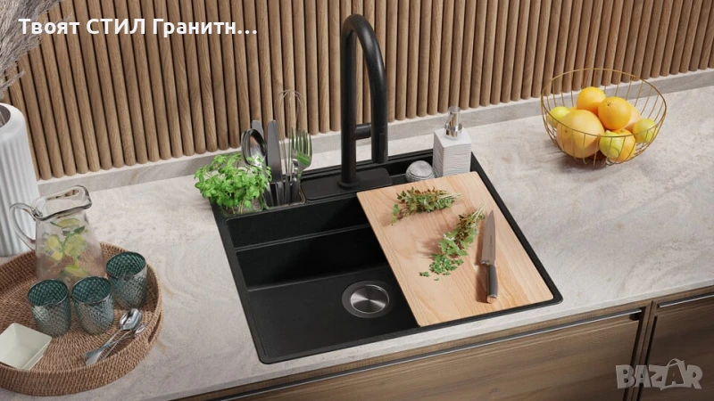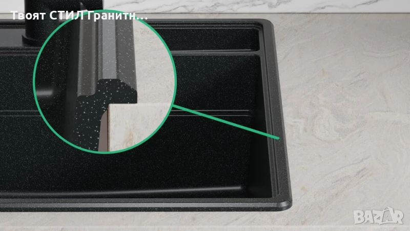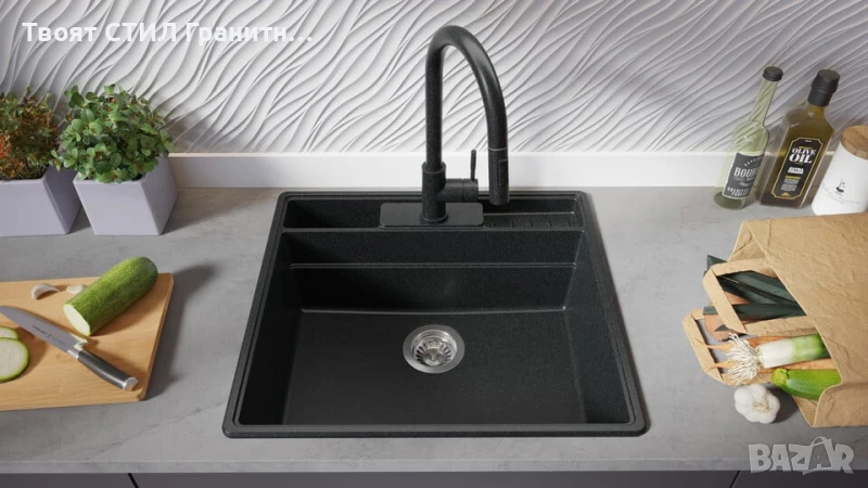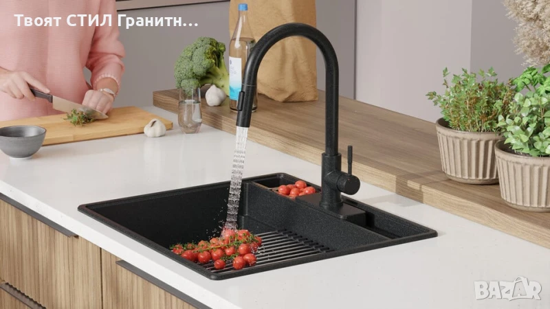 - Модерна кухненска мивка от гранит – издръжлива, елегантна и изработена за дълготрайност.