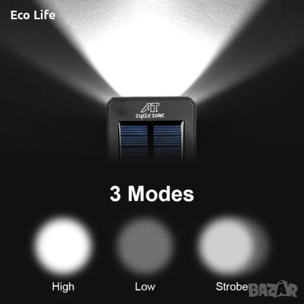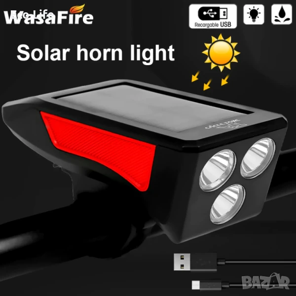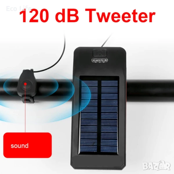 Фар за велосипед с клаксон, 2200 mAh Powerbank и соларно зареждане