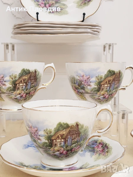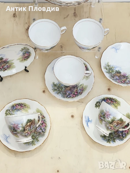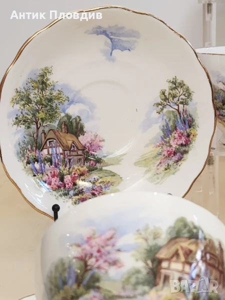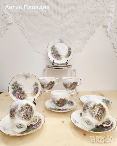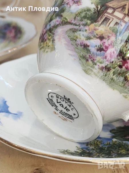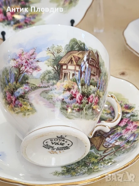 Очарователен винтидж чаен сервиз от английската марка Royal Vale, изработен от фин костен порцелан. Сервизът включва 6 чаши с подложни чинии, всяка от които е украсена с живописна сцена на селска къща, заобиколена от цъфтяща градина и нежно синьо небе. Декорацията е изпълнена в топли пастелни тонове с фина златна линия по ръбовете, която придава допълнителна елегантност.