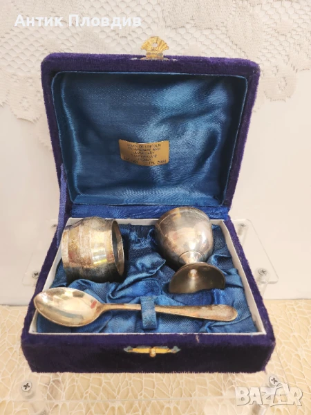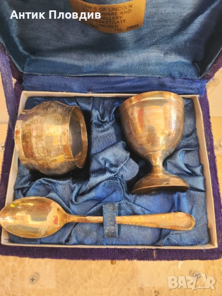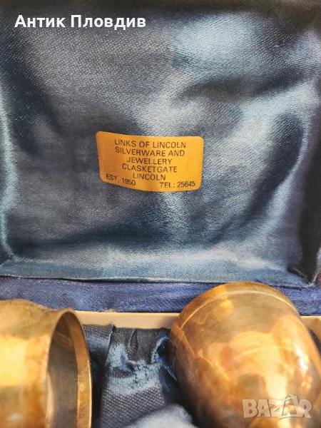 Класически английски комплект за кръщене, състоящ се от малка чашка, пръстен за салфетка и лъжичка, подредени в оригинална синя кадифена кутия със сатенена подплата. Комплектът е произведен от Links of Lincoln – реномирана марка за посребрени изделия и бижута, основана през 1950 година. Всеки от елементите носи типичния за периода стил и елегантна визия. Идеален избор за подарък при кръщене или като спомен със сантиментална и колекционерска стойност.