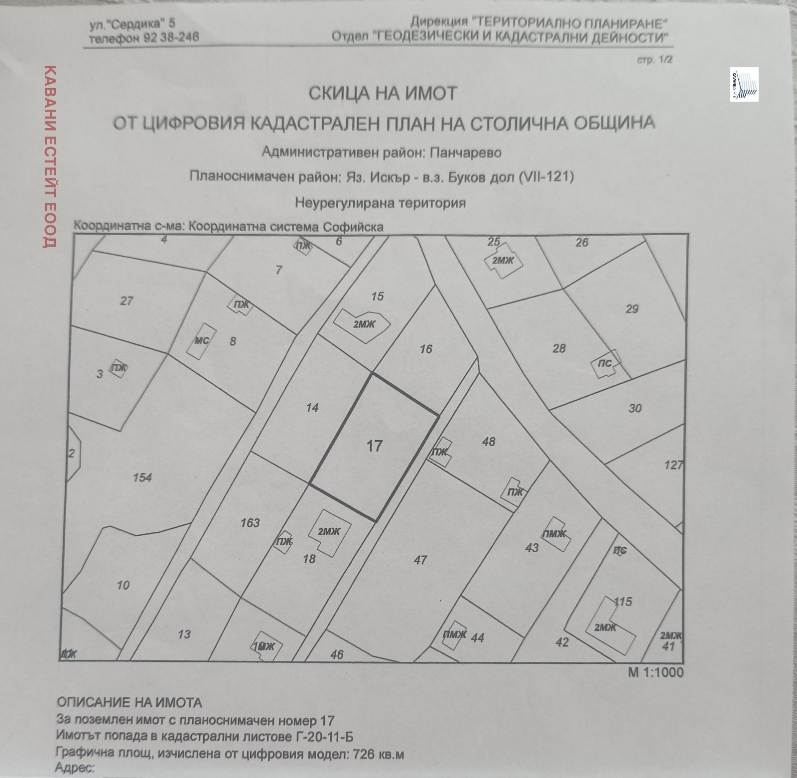 Продава се поземлен имот с площ 726 кв.м, разположен във вилна зона Буковдол, в близост до язовир Искър. Имотът попада в зона Жв с параметри на застрояване: плътност 20%, КИНТ 0.6 и максимална кота корниз 7 метра.
