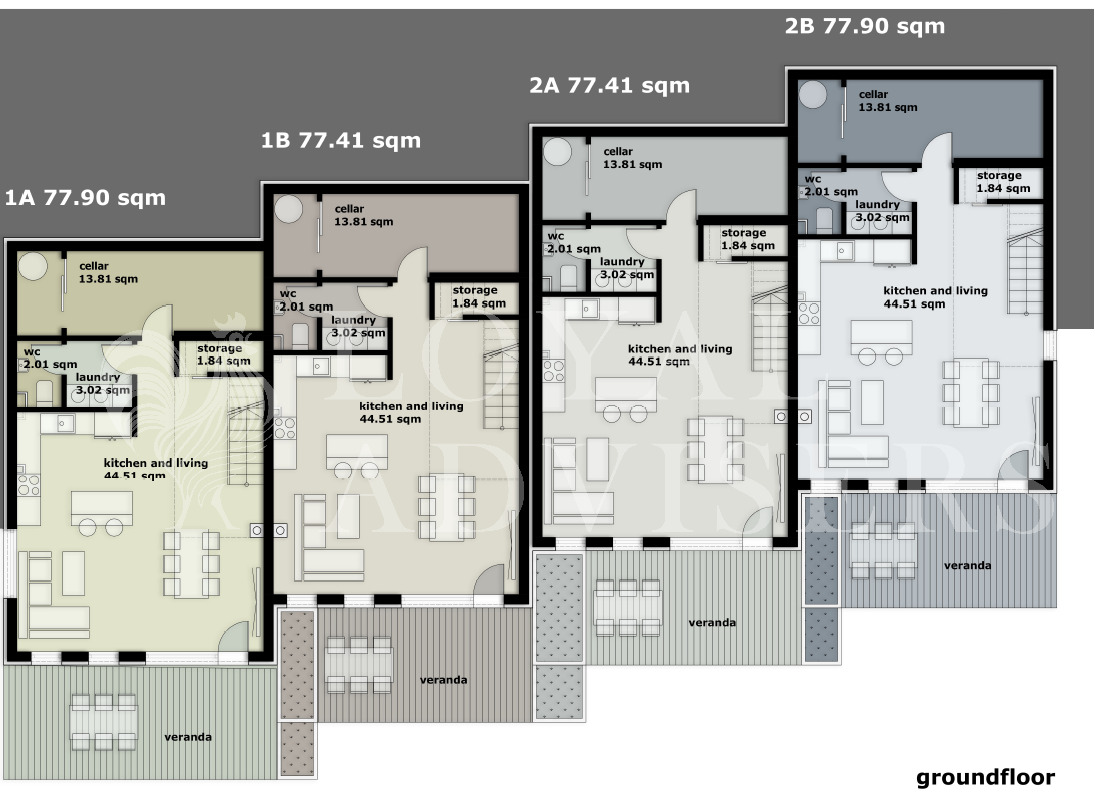 Имотите се състоят от един полуподземен и два надземни жилищни етажа, както и изцяло използваем покрив със следното разпределение: