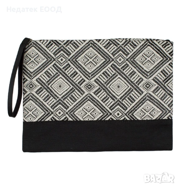 Лятна платнена чантичка за тоалетни принадлежности, бяла и черна с ромбичен мотив. Има цип и дръжка. В нея могат да се съхраняват мобилен телефон, ключове, очила и лични вещи.