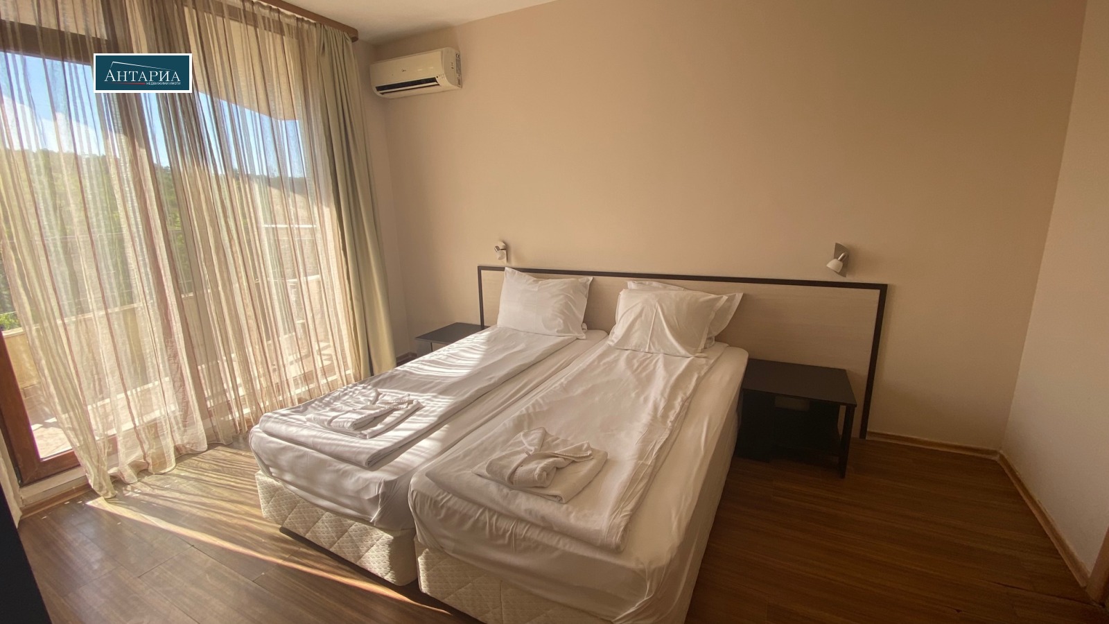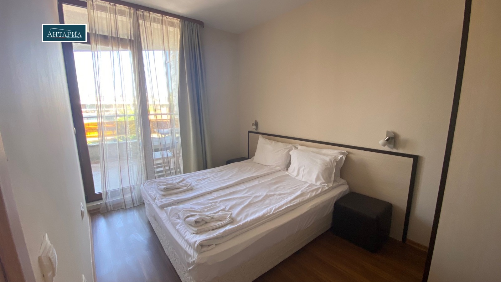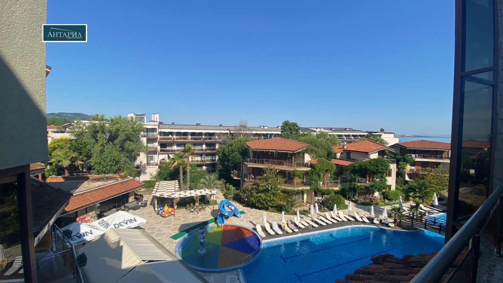 Апартамент на първа линия и с изглед към морето в к-с Лагуна бийч. Апартаментът е на четвърти етаж, функционално разпределен в просторна дневна с трапезария и кухня, голяма тераса с изглед към красиво аранжираната територия и басейна в комплекса, две самостоятелни спални, всяка с излаз към втора голяма тераса, две бани с тоалетна.