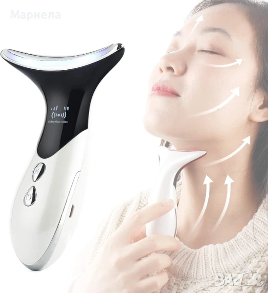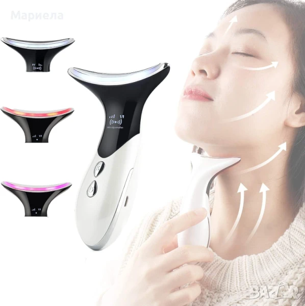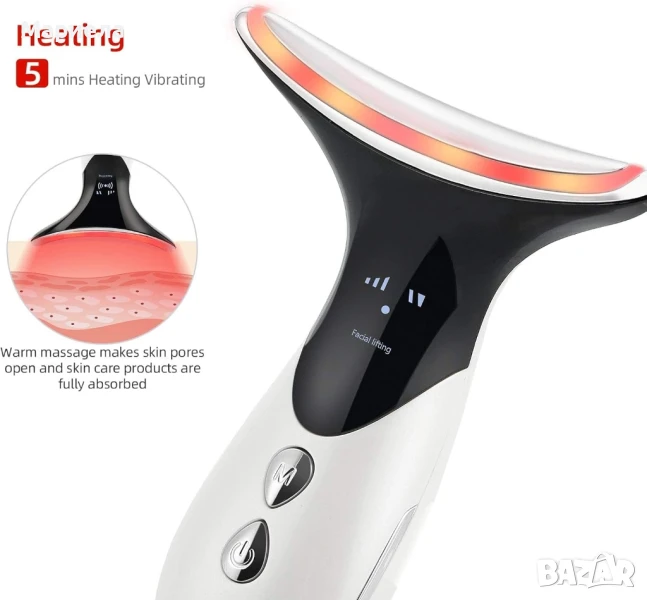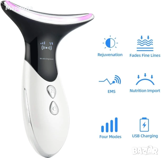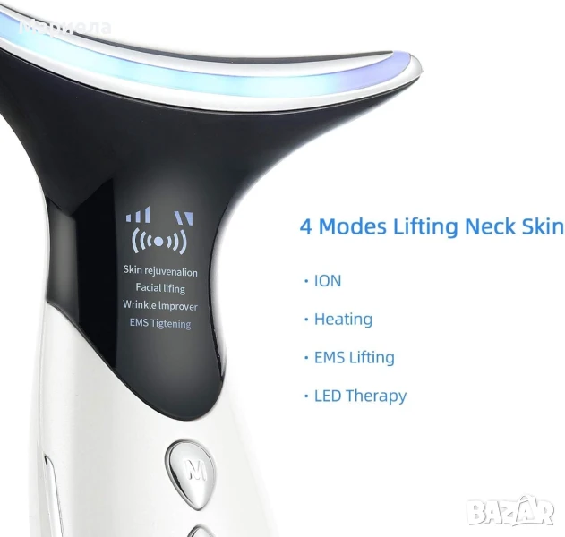 Загряване, EMS за лифтинг на кожата на шията, LED терапията . Включва синя LED светлина, лилава LED светлина и червена LED светлина, внос на йони, висока честота, прави продукта за грижа за кожата дълбоко проникващ в кожата и насърчава абсорбцията.