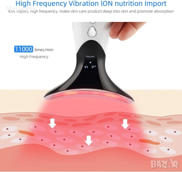 Дъгообразната форма пасва на врата и тялото, масажира гладко, а топлият масаж отваря порите на кожата и продуктите за грижа за кожата се абсорбират напълно.