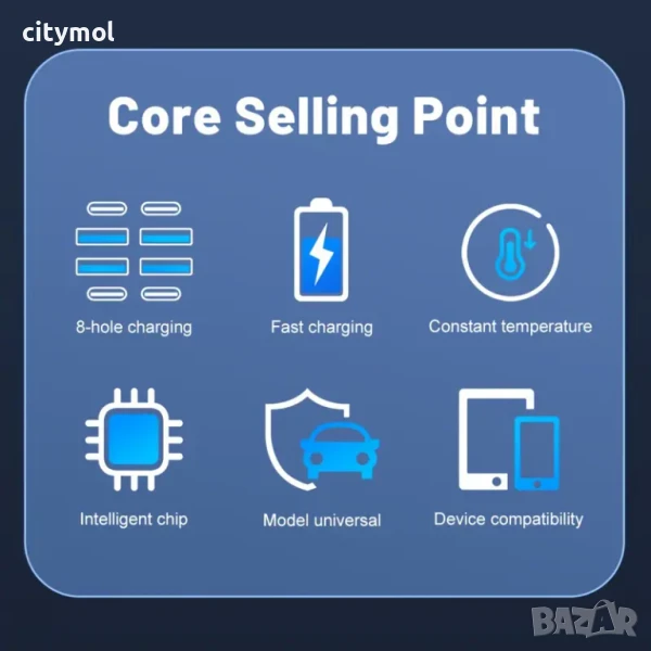 1. LED светлина 2. 8 порта за зареждане на до 8 устройства едновременно. 3. Съвместим с различни модели, входно напрежение от 12 до 24 V. 4. Зареждайте всички телефони, цифрови фотоапарати и таблети.
