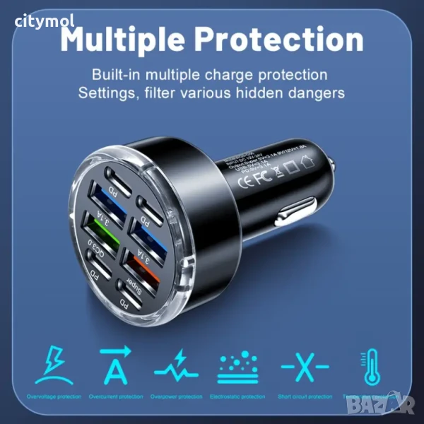 Универсално зарядно за автомобил 8 порта (4 x USB и 4 x Type C ) Fast Charge, QC 3.0.