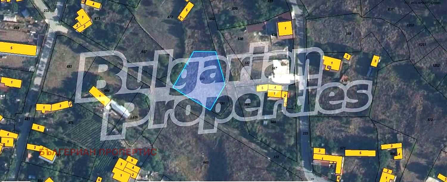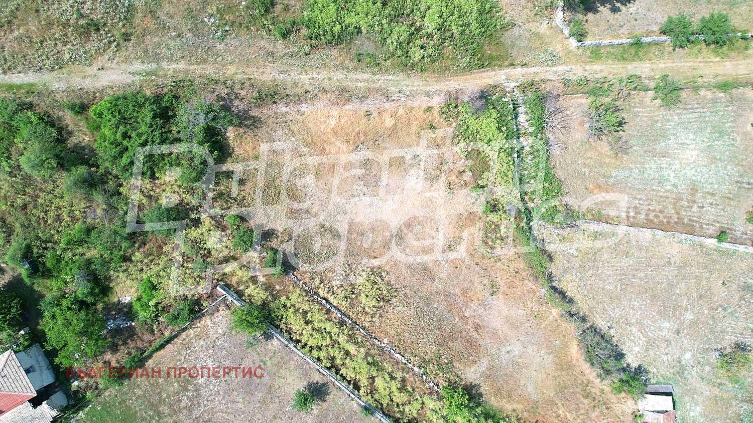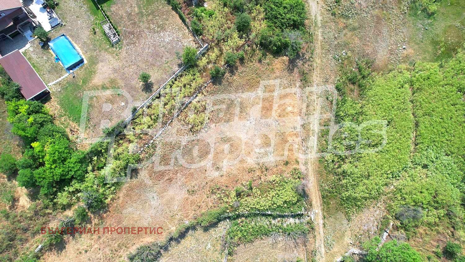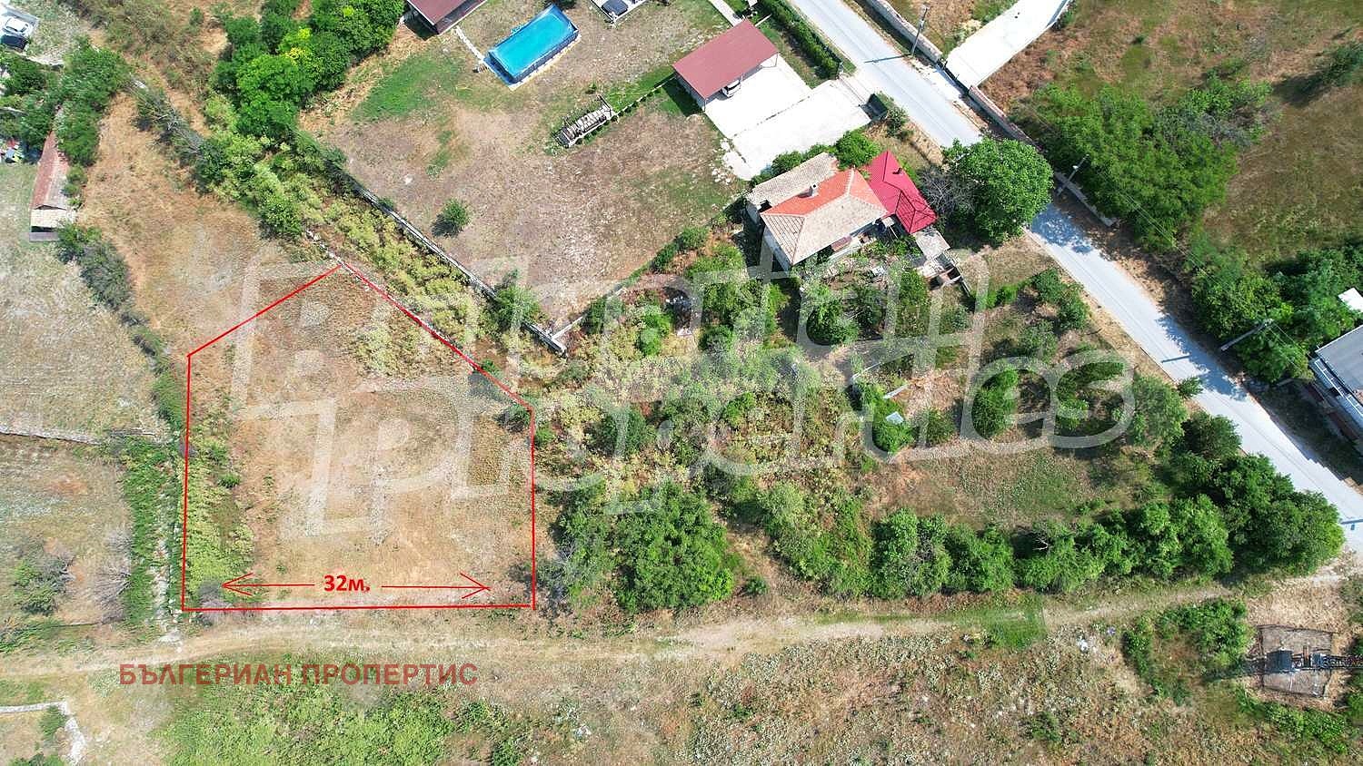 Имотът (1011 кв.м.) е с лице на път от двете си страни - съответно 32 и 25 метра. Подходящ за разделяне на два парцела.Ток и вода има само на няколко метра в съседните имоти. Пътят пред парцела е черен, на 100 метра от асфалт.
