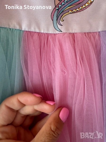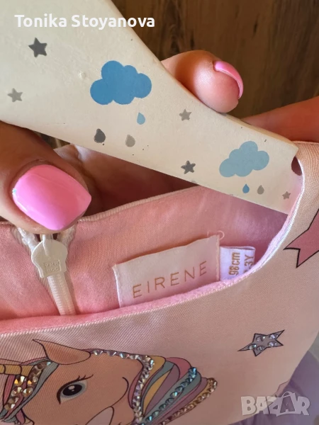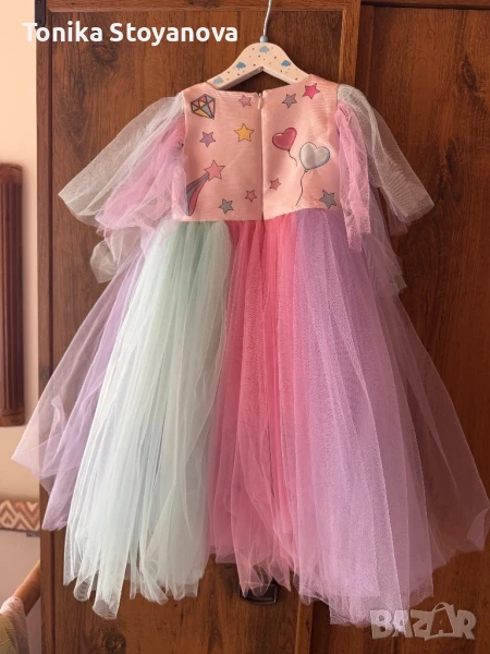 Рокля за момиченце в размер 98, прекрасна, цветна и много нежна. Моята дъщеря я носи до 110 размер. На българската марка Eirene, със старо име lovemadelove, рокли от най-високо качество. За съжаление е обличана само веднъж, не успяхме да и намерим много поводи.