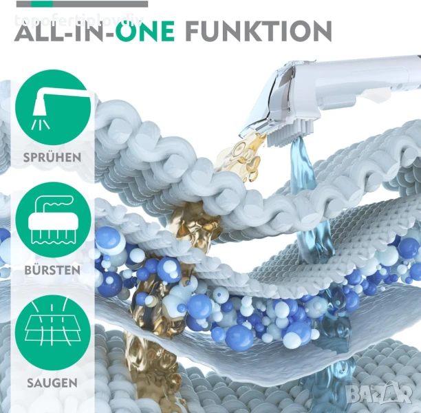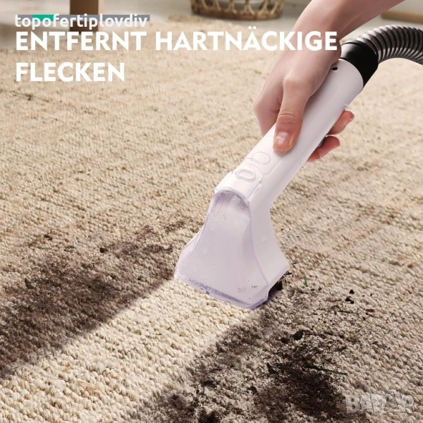 Мощно почистване: 400 W моторът е идеален за ефективно почистване на килими или дивани, както и на седалки и тапицерии на вашия автомобил. 1 накрайник-четка за килими, тапицерии, стълби и 1 ъглов накрайник за пукнатини. Перфектно прилягане за почистване на петна във всички ъгли. С вграден маркуч 120 см и отделно място за съхранение на маркуча.
